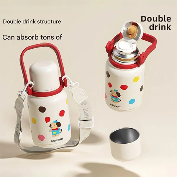 Die spülmaschinenfeste Isolierflasche verfügt über einen großen Griff und einen Schultergurt, der für Kinder und Erwachsene geeignet ist, um sie anzuheben und ihre Hände frei zu haben. Der Deckel kann auch als Wasserbecher dienen